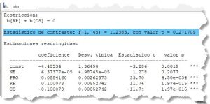 El resultado del segundo contraste planeado H_0: \beta_3 = -\beta_4 o en notación de Gretl H_0: b[RP] + b[CS] = 0 permite concluir que esta hipótesis es compatible con la información muestral disponible para los niveles de significación de uso habitual (1%, 5% o 10%).