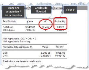 permite concluir que la hipótesis nula H_0: \beta_1 = \beta_4 =0 se rechaza para niveles de significación superiores al 3,72%.