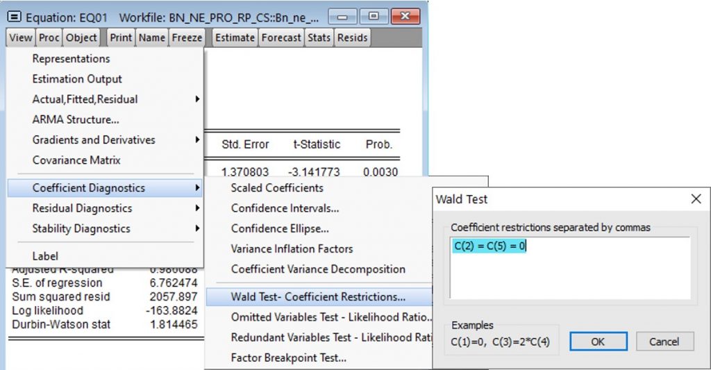 - EViews: «View«- «Coefficient Diagnostics» –«Wald Test. Coefficient Restrictions».
