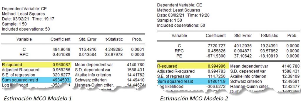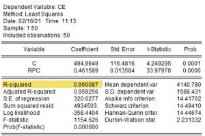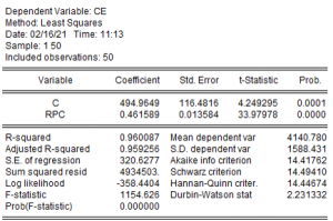 Para medir el efecto de la renta per cápita (expresada en miles de euros) sobre el consumo de energía (expresado en kilovatios/hora), se han recogido datos para 50 individuos y se ha estimado por MCO el modelo que relaciona a ambas variables.