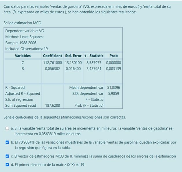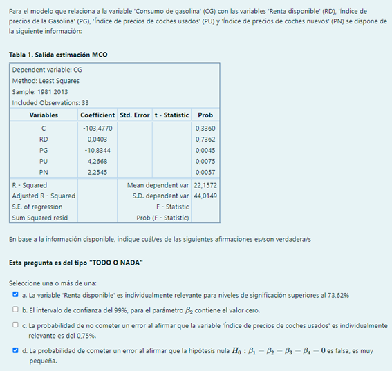 d. Al nivel de significación de 10%, la información muestral contradice cualquier valor de la variable ‘Cantidad demandada de un bien’ inferior a 1588,58 y superior a 1668,28 para la observación 56.