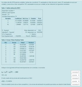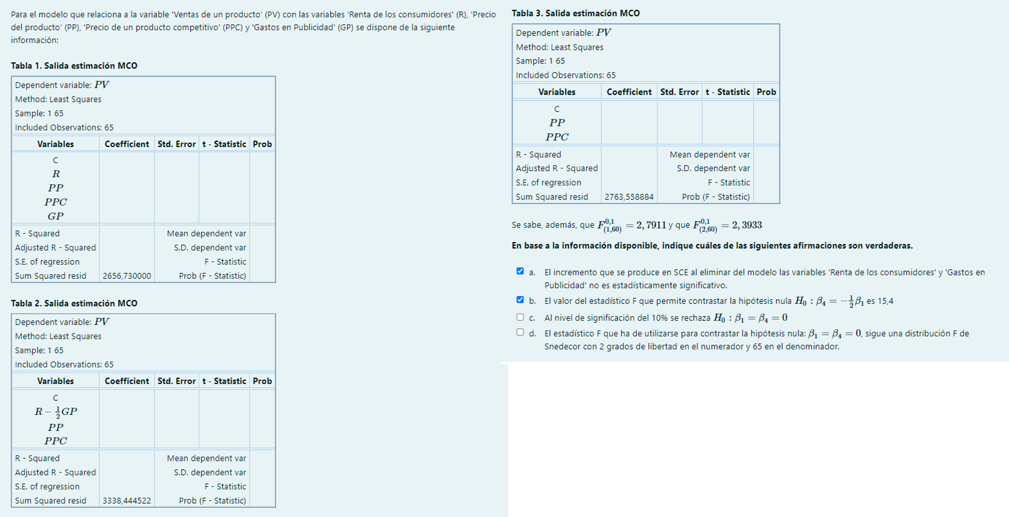 a. Al nivel de significación del 10% ninguna de las variables ‘Renta de los consumidores’ y ‘Precio de un producto competitivo’ se muestran individualmente relevantes.