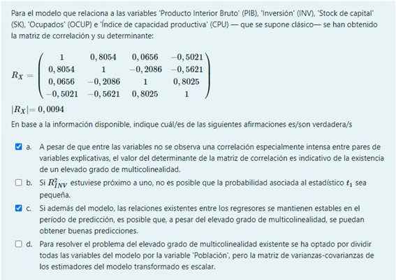 c. Los elementos de la matriz de correlación —RX — son los coeficientes de correlación lineal entre las variables explicativas del modelo.