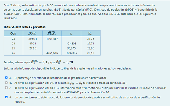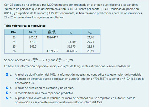 c. Al nivel de significación del 10%, la información muestral contradice cualquier valor de la variable ‘Número de personas que se desplazan en autobús’ superior a 4799,6537 para la observación 26. El extremo superior del intervalo de confianza es: 4799,535+(1,73*23,19)=4799,6537