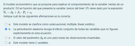 d. El modelo tiene 4 variables: el regresando —‘Ventas de un producto’—, dos regresores —el regresor ficticio y la variable ‘precio del bien’— y la perturbación aleatoria.