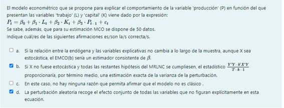 c. Para demostrar que el EMCO(b) es insesgado es necesario asumir que la esperanza matemática de las perturbaciones es nula, que los regresores son no estocásticos y que los parámetros \beta son constantes.