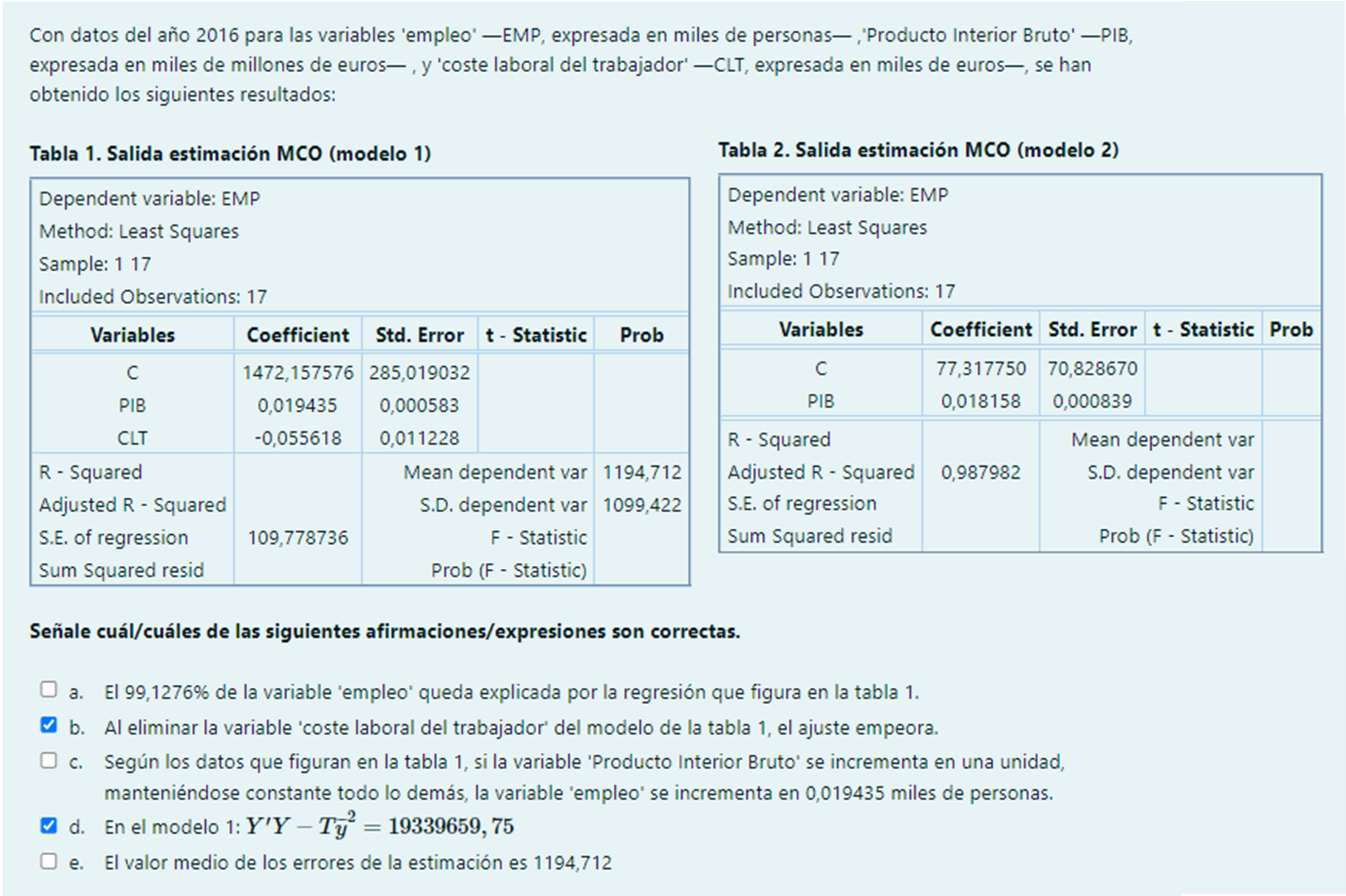 Los modelos planteados en los enunciados son diferentes tanto en lo referente al número de observaciones como en el número de variables explicativas. Cada alumno/a tiene un conjunto personalizado de respuestas y no todas las tablas proporcionan la misma información.