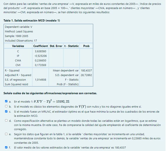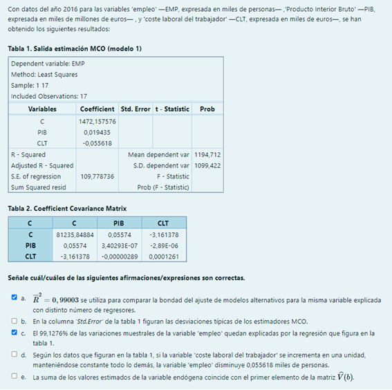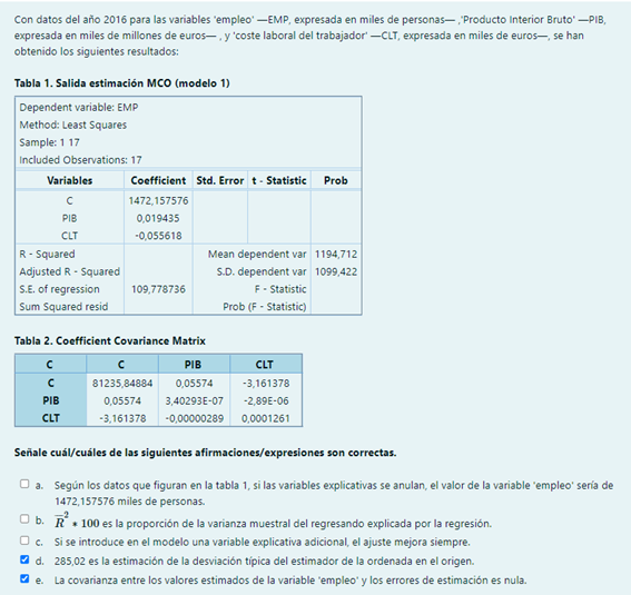 d. Según los datos que figuran en la tabla 1, si la variable ‘coste laboral por trabajador’ se incrementa en una unidad, manteniéndose constante todo lo demás, se estima que por término medio la variable ‘empleo’ disminuye 0.055618 miles de personas.