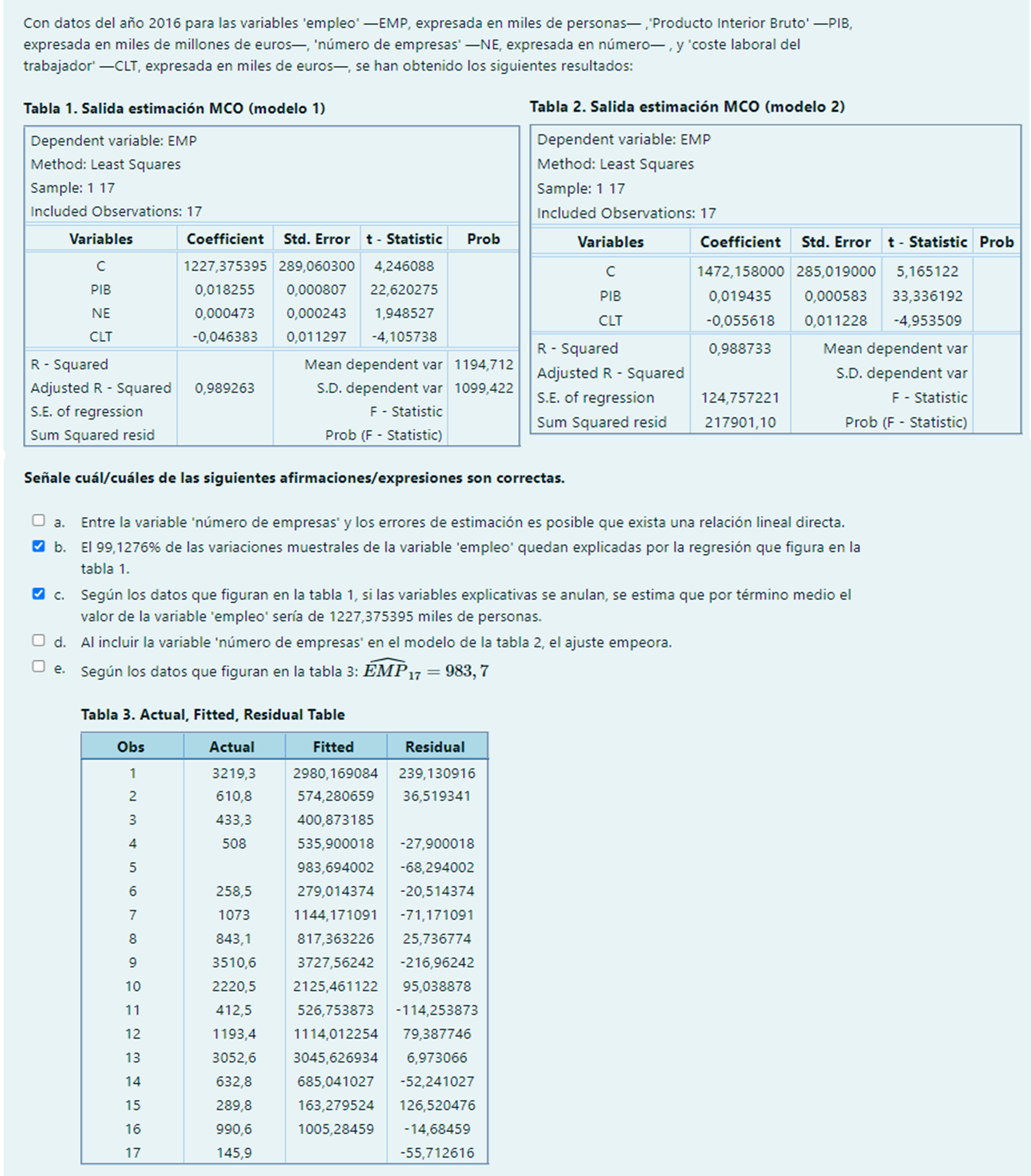 b. Por término medio, el porcentaje de error que se comete al estimar los valores de la variable ‘empleo’ utilizando la regresión que figura en la tabla 1, es del 8,34%.